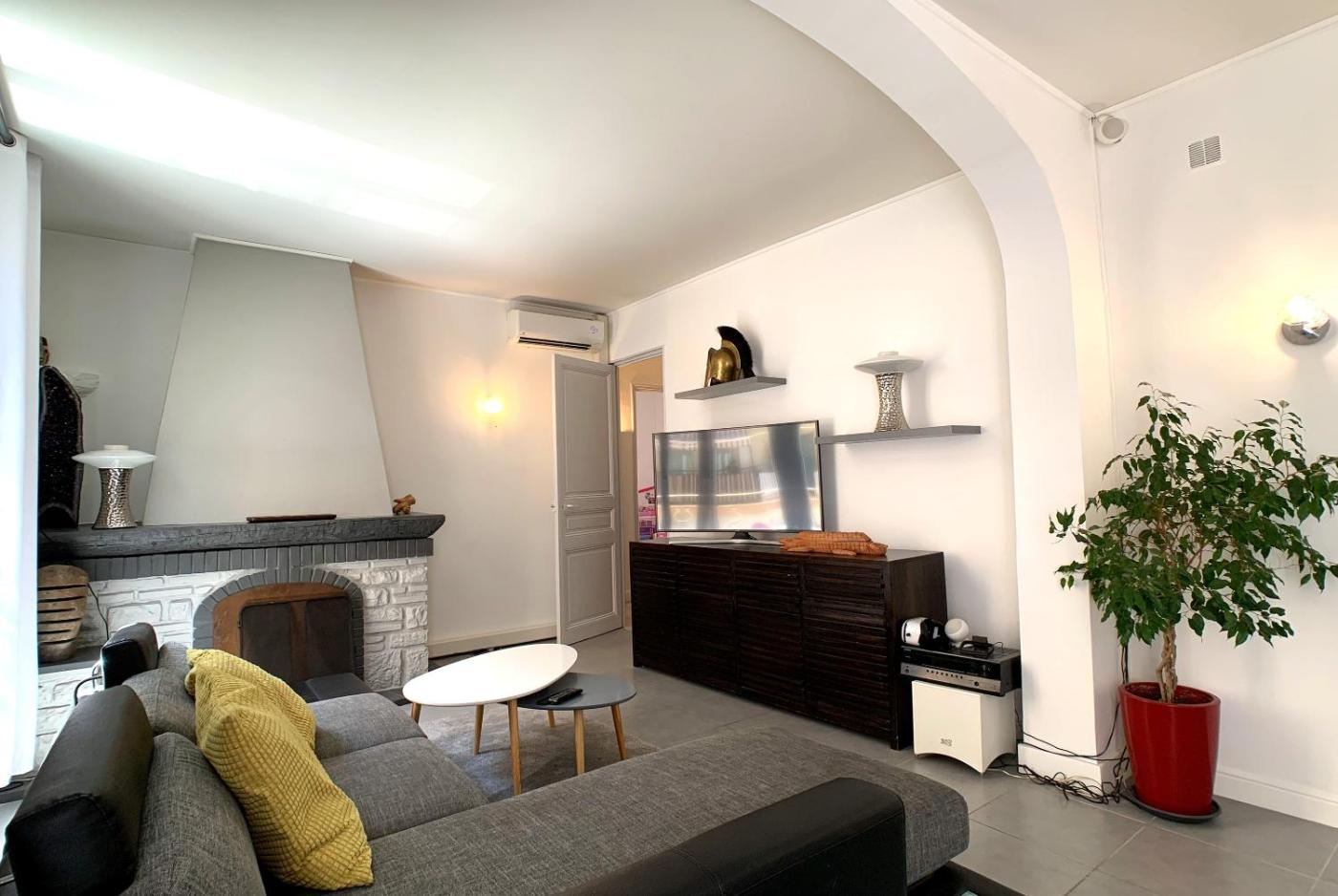 Appartement avec Terrasse. This apartment features a fireplace. Boasting a private entrance, this spacious apartment also features 3 separate bedrooms and 2 bathrooms with a bath and a shower. Guests can make meals in the kitchen that has a dishwasher, kitchenware, an oven and a microwave. The air-conditioned apartment features a TV, a washing machine, a coffee machine, tumble dryer as well as garden views. The unit has 3 beds.