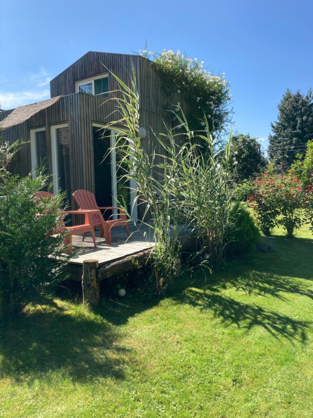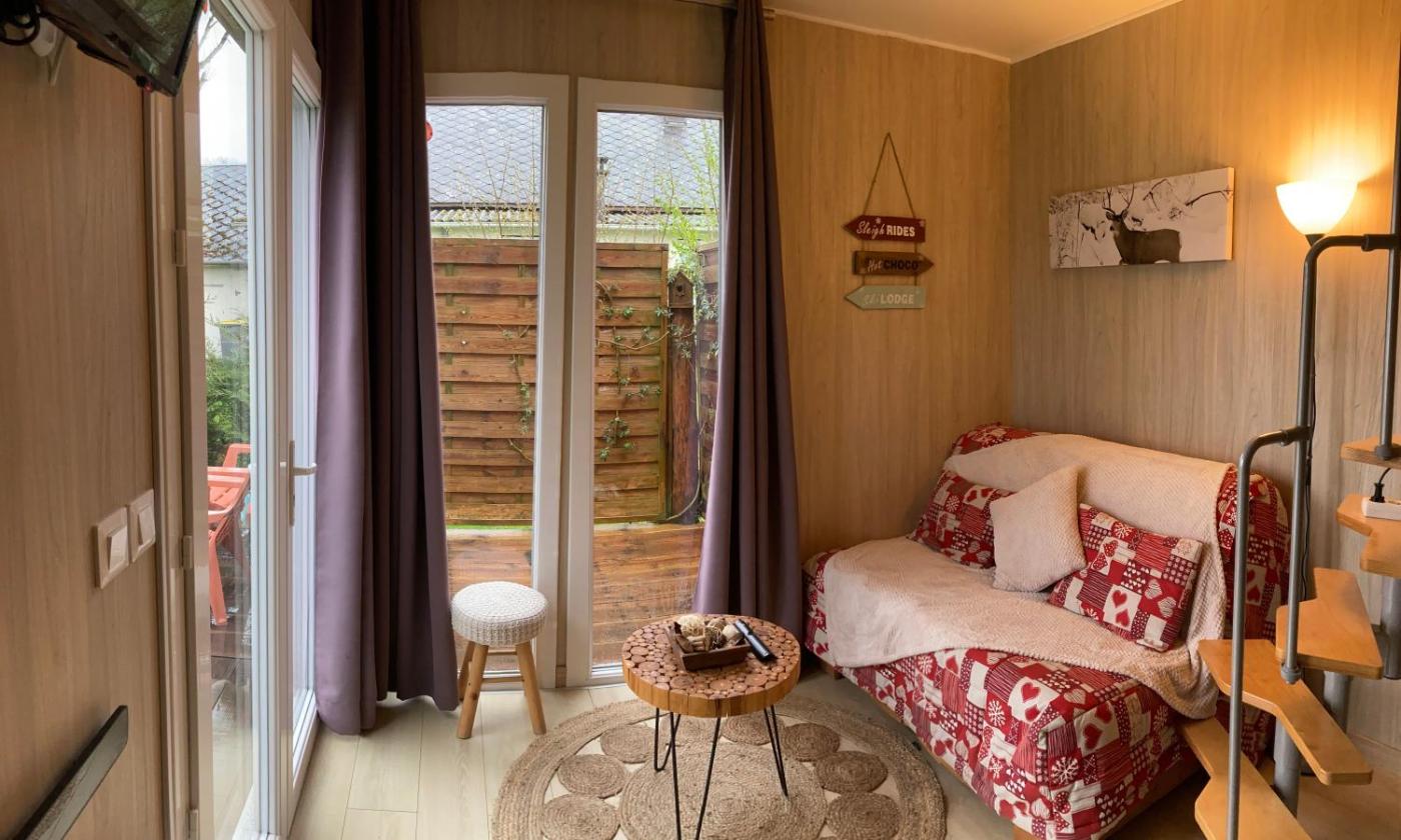 Chambre Double - Vue sur Jardin. This is a tiny house that includes a bathroom with a shower. Please note that WiFi is not available in this unit. Please note that this unit features a steep staircase and is not suitable for guests with reduced mobility. The mezzanine bedroom has a low ceiling. ;