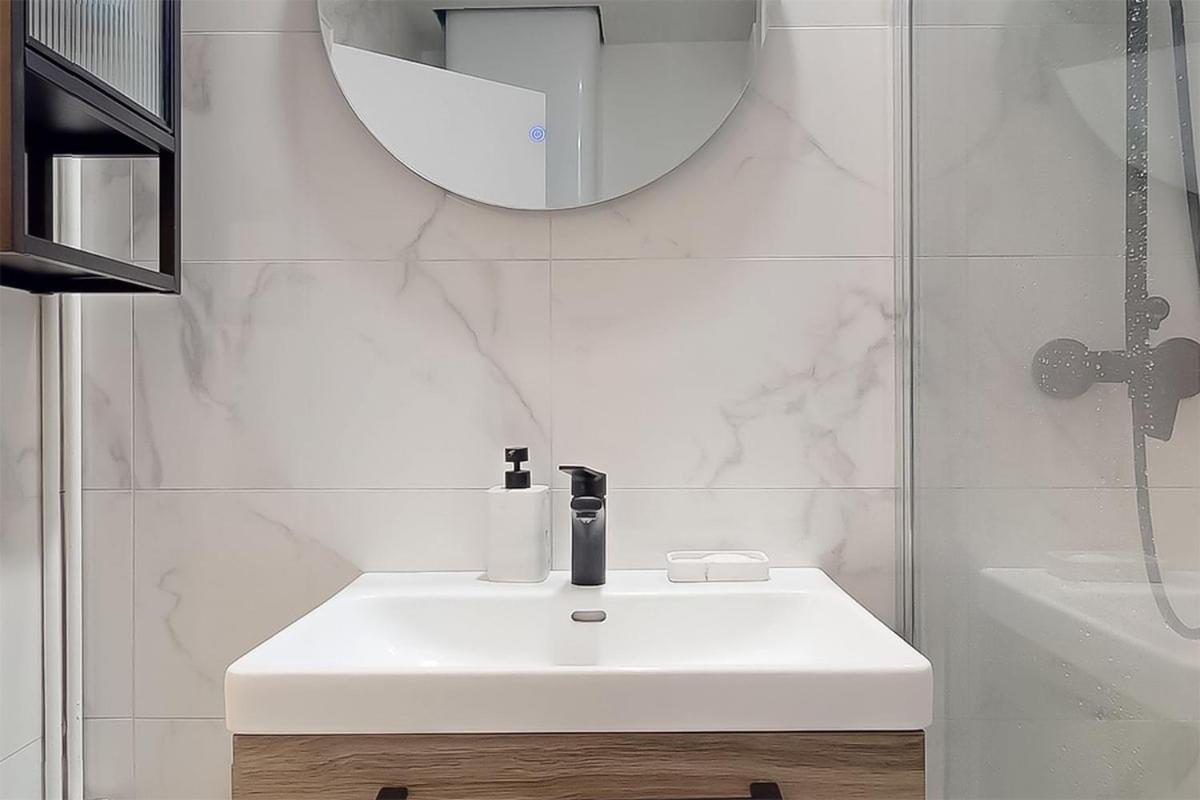 Cet appartement comporte 1 chambre, une télévision à écran plat, la climatisation et un salon.