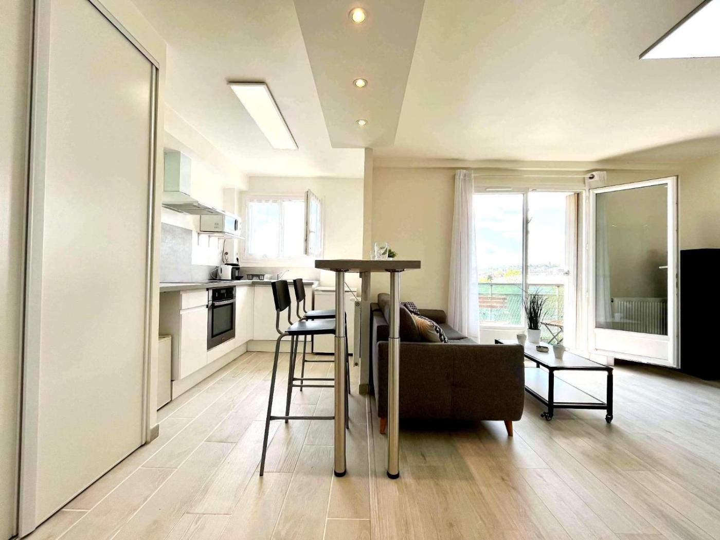 Appartement 1 Chambre. Boasting a private entrance, this apartment features 1 living room, 1 separate bedroom and 1 bathroom with a shower and a hairdryer. The well-fitted kitchen has a stovetop, a refrigerator, kitchenware and an oven. Featuring a terrace with city views, this apartment also features a washing machine and a flat-screen TV. The unit has 2 beds.