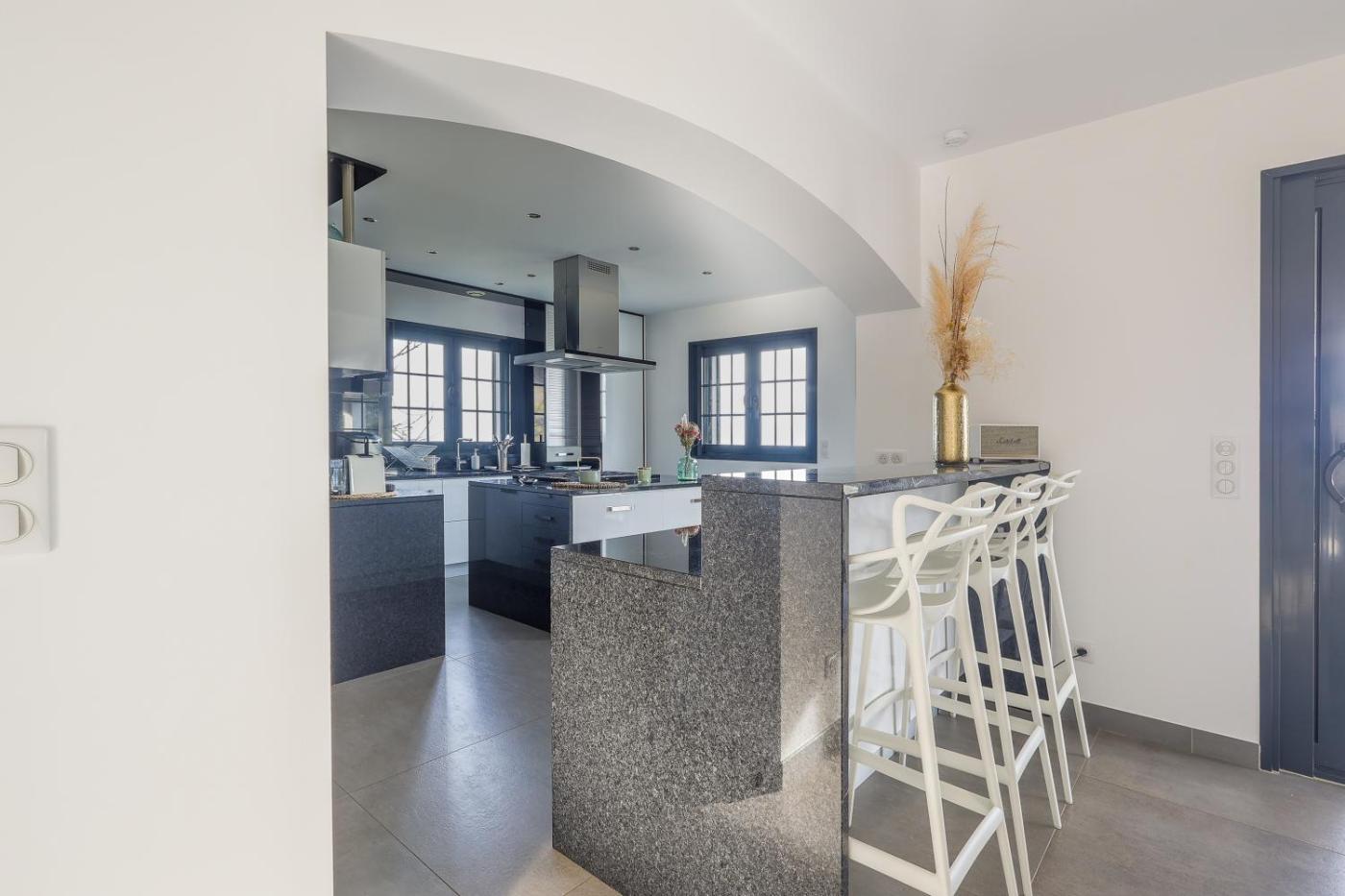 Maison 5 Chambres. This holiday homes special feature is the private pool. This spacious holiday home comprises 1 living room, 5 separate bedrooms and 5 bathrooms with a bath and a shower. The well-equipped kitchen features a refrigerator, a dishwasher, kitchenware and an oven. The air-conditioned holiday home provides a TV, a washing machine, a tea and coffee maker, a wardrobe as well as sea views. The unit offers 7 beds.
