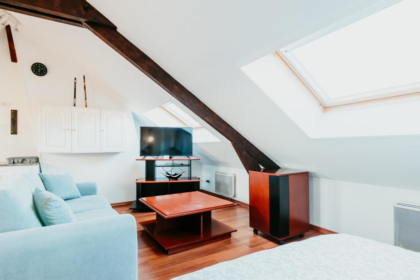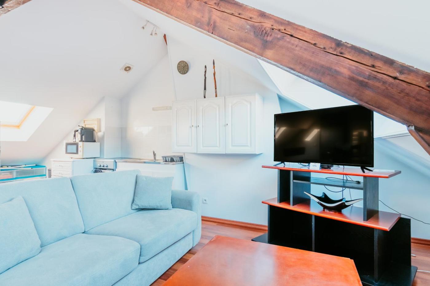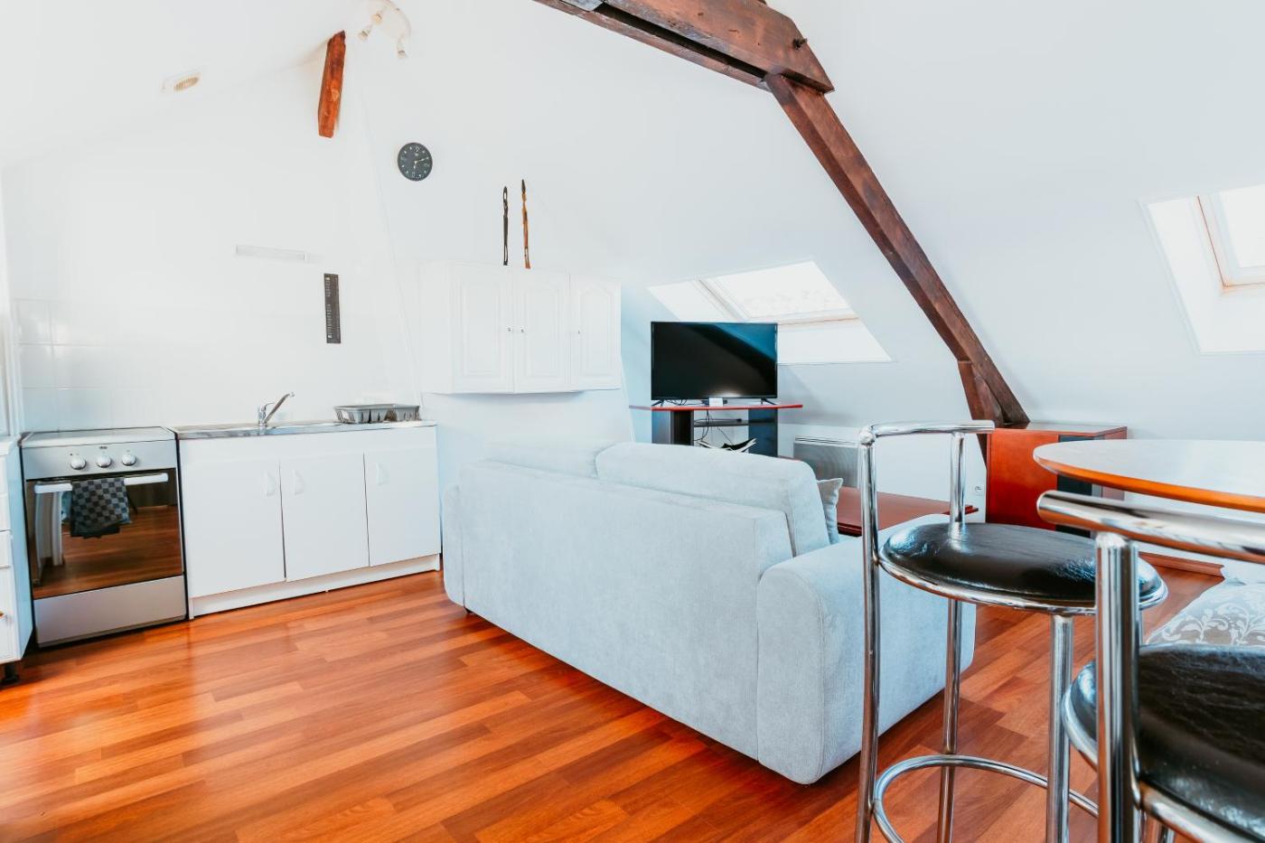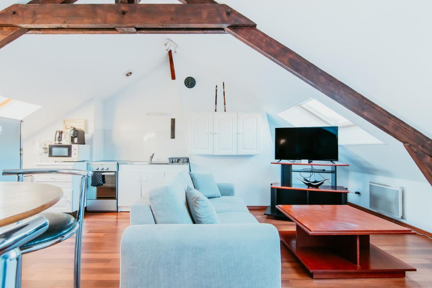 Appartement 1 Chambre. This apartment features a kitchen, a seating area, 1 separate bedroom and 1 bathroom with a shower. Guests can make meals in the kitchen that has a stovetop, a refrigerator, kitchenware and a microwave. The apartment features a washing machine, a tea and coffee maker, a dining area, heating, as well as a flat-screen TV with cable channels. The unit has 1 bed.