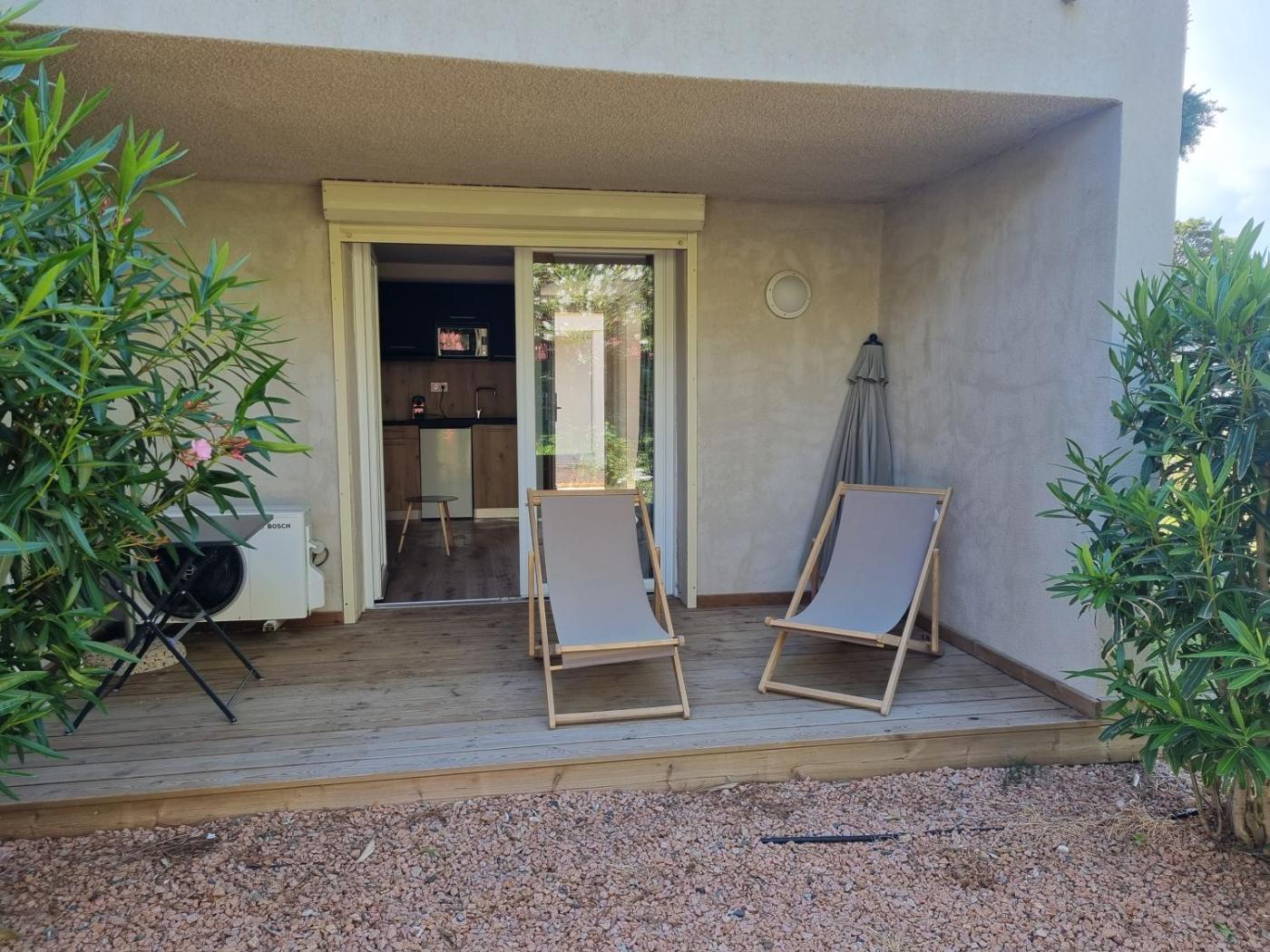 Studio avec Terrasse. This studios standout feature is the private pool. In the kitchenette, guests will find a stovetop, a refrigerator, kitchenware and a microwave. The studio offers air conditioning, a private entrance, a terrace with garden views as well as a private bathroom boasting a walk-in shower. The unit has 1 bed.