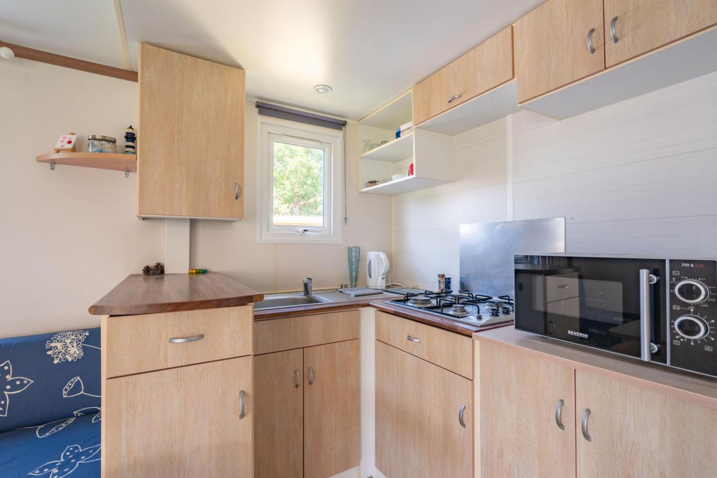 Mobile Home. Boasting a private entrance, this mobile home also includes 3 separate bedrooms and 1 bathroom with a shower. The mobile homes kitchen, which has kitchenware and a microwave, is available for cooking and storing food. Featuring a patio, this mobile home also offers a coffee machine, a barbecue and a TV with cable channels. The unit has 4 beds.