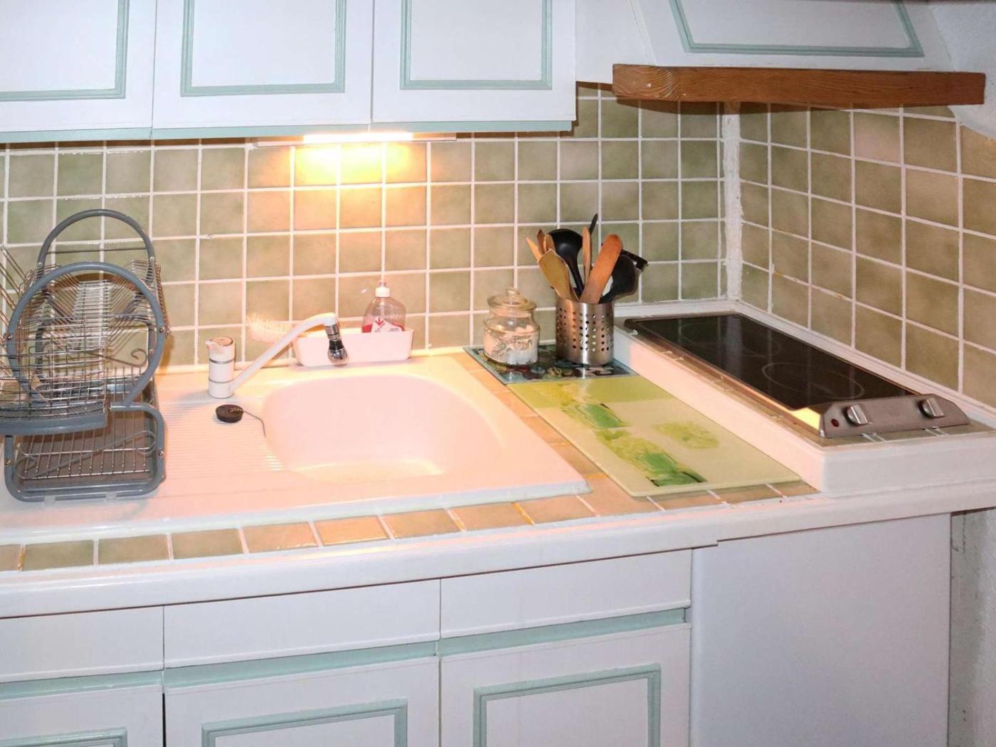 Cet appartement comporte une cuisine entièrement équipée, un coin repas et une télévision.