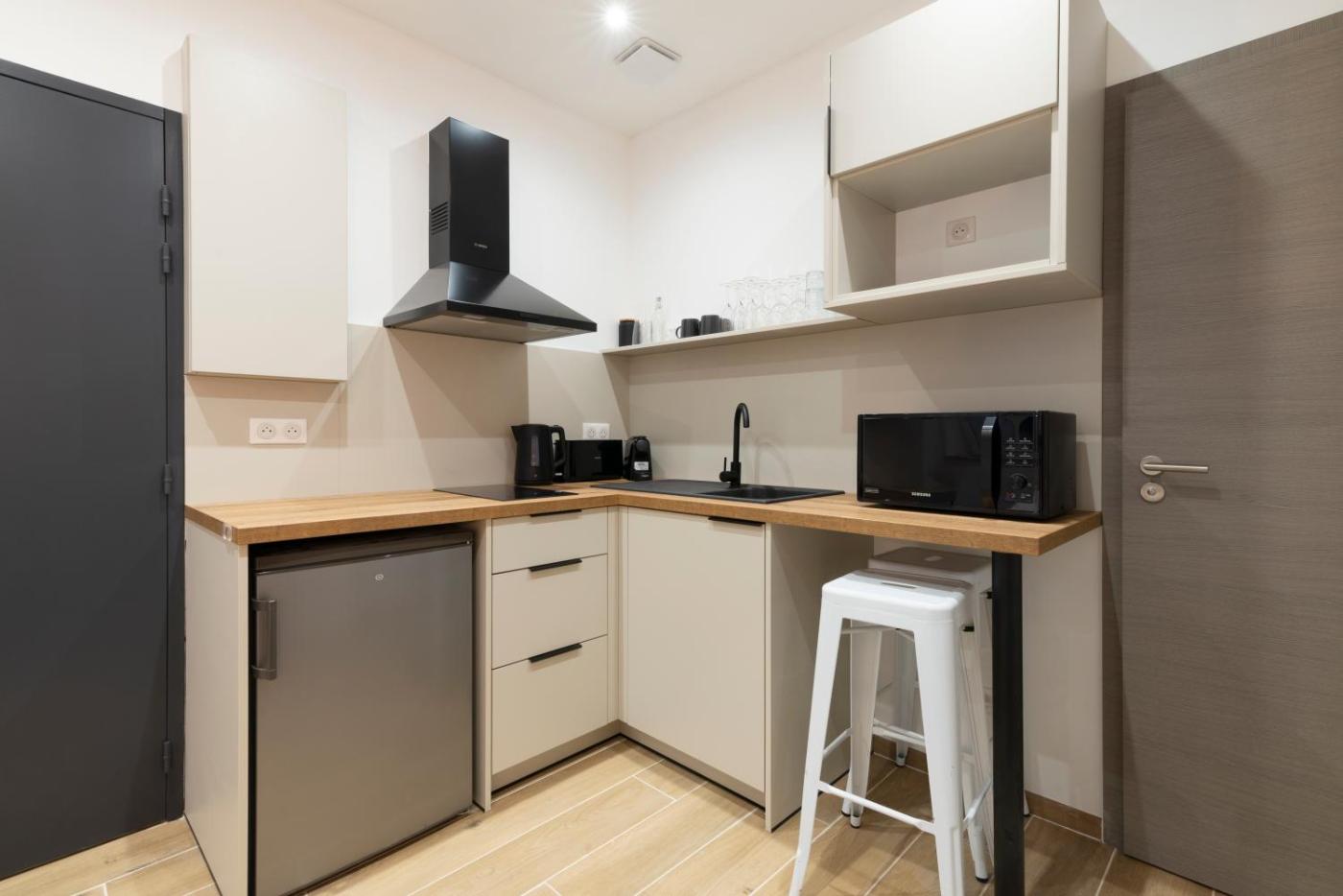 Studio. The studio features a dining area, a wardrobe, as well as a private bathroom boasting a shower and a hairdryer. The well-fitted kitchen has a stovetop, a refrigerator and a microwave. The studio offers a washing machine, soundproof walls, a tea and coffee maker, a flat-screen TV with streaming services, as well as city views. The unit has 1 bed.