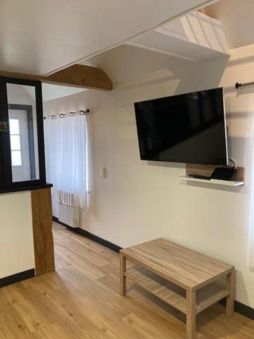 Cet appartement en rez-de-chaussée comporte 1 chambre, une cuisine bien équipée avec un réfrigérateur et un four, un salon et une télévision à écran plat.