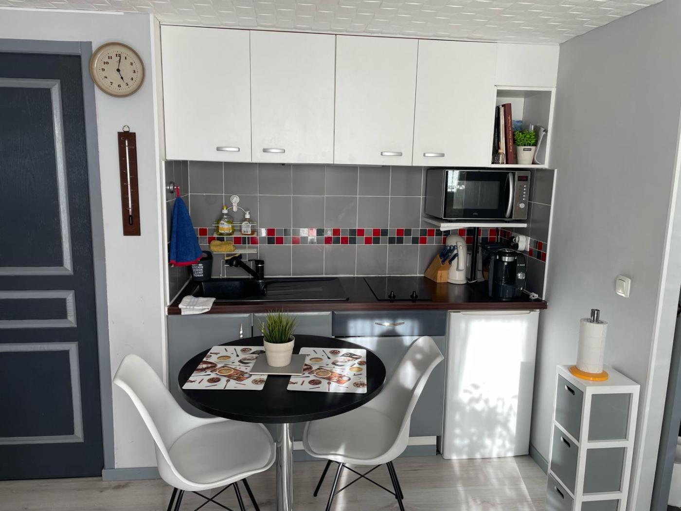 Cet appartement en rez-de-chaussée comporte 1 chambre, une télévision à écran plat, ainsi qu’une kitchenette entièrement équipée avec un réfrigérateur et un four.