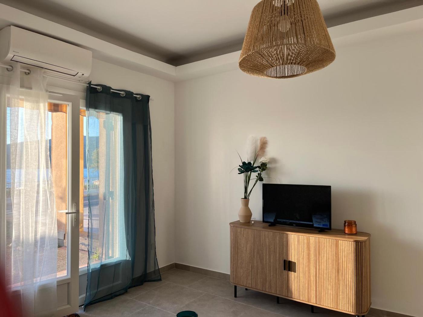 Appartement - Rez-de-Chaussée. This air-conditioned apartment features 1 living room, 1 separate bedroom and 1 bathroom with a shower. Guests can make meals in the kitchen that has a stovetop, a refrigerator, kitchenware and an oven. Boasting a terrace with sea views, this apartment also features a washing machine and a flat-screen TV. The unit has 2 beds.
