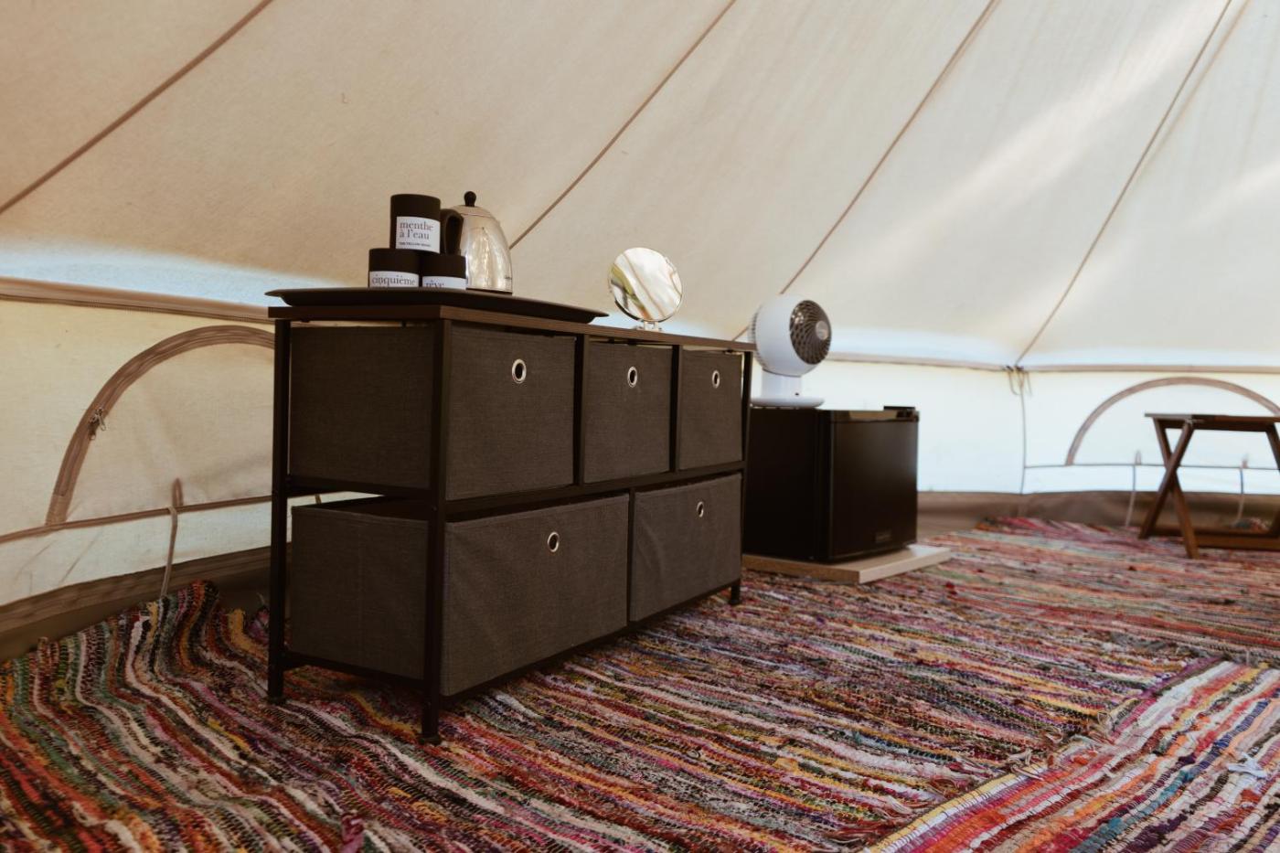 Tente. This tent offers a shared bathroom, and a dining area. Guests will find a stovetop, a refrigerator, kitchenware and an oven in the kitchen. The tent also features a barbecue. Among the room amenities are a private entrance, a tea and coffee maker, a seating area as well as an outdoor dining area and garden views. ;
