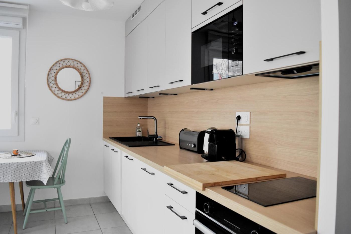 Appartement 1 Chambre. Featuring a private entrance, this apartment comprises 1 living room, 1 separate bedroom and 1 bathroom with a walk-in shower and a hairdryer. Meals can be prepared in the kitchen, which comes with a stovetop, a refrigerator, kitchenware and an oven. Boasting a terrace with garden views, this apartment also provides a washing machine and a flat-screen TV. The unit offers 2 beds.