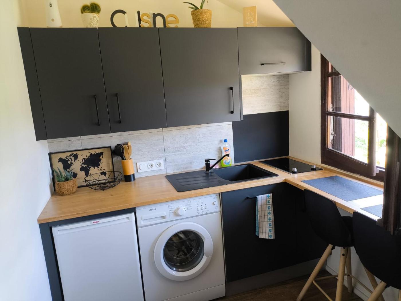 Appartement 1 Chambre. The apartment has 1 bedroom and 1 bathroom with a walk-in shower and free toiletries. The well-equipped kitchen features a stovetop, a refrigerator, kitchenware and an oven. The apartment offers a flat-screen TV with streaming services, a washing machine, a tea and coffee maker, a dining area as well as lake views. The unit has 1 bed.