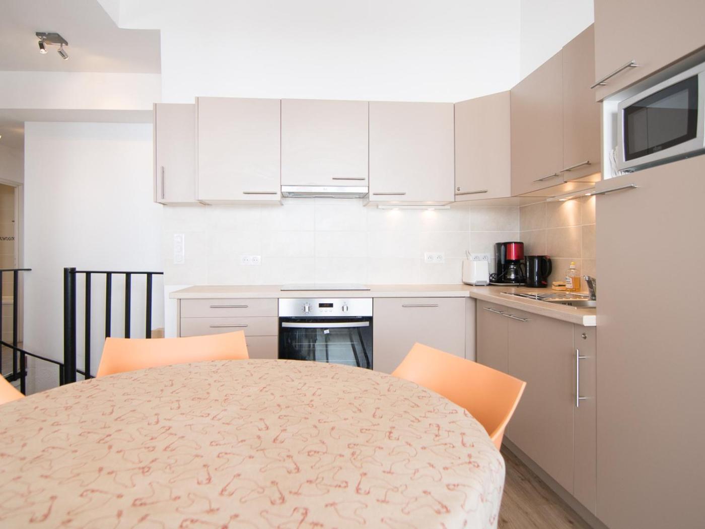 Appartement (6 Adultes). Featuring a private entrance, this apartment comprises 2 bedrooms, 2 bathrooms and a kitchen. The fully equipped kitchen features a refrigerator, a dishwasher, kitchenware and a microwave. This apartment has a dining area, heating and a TV.