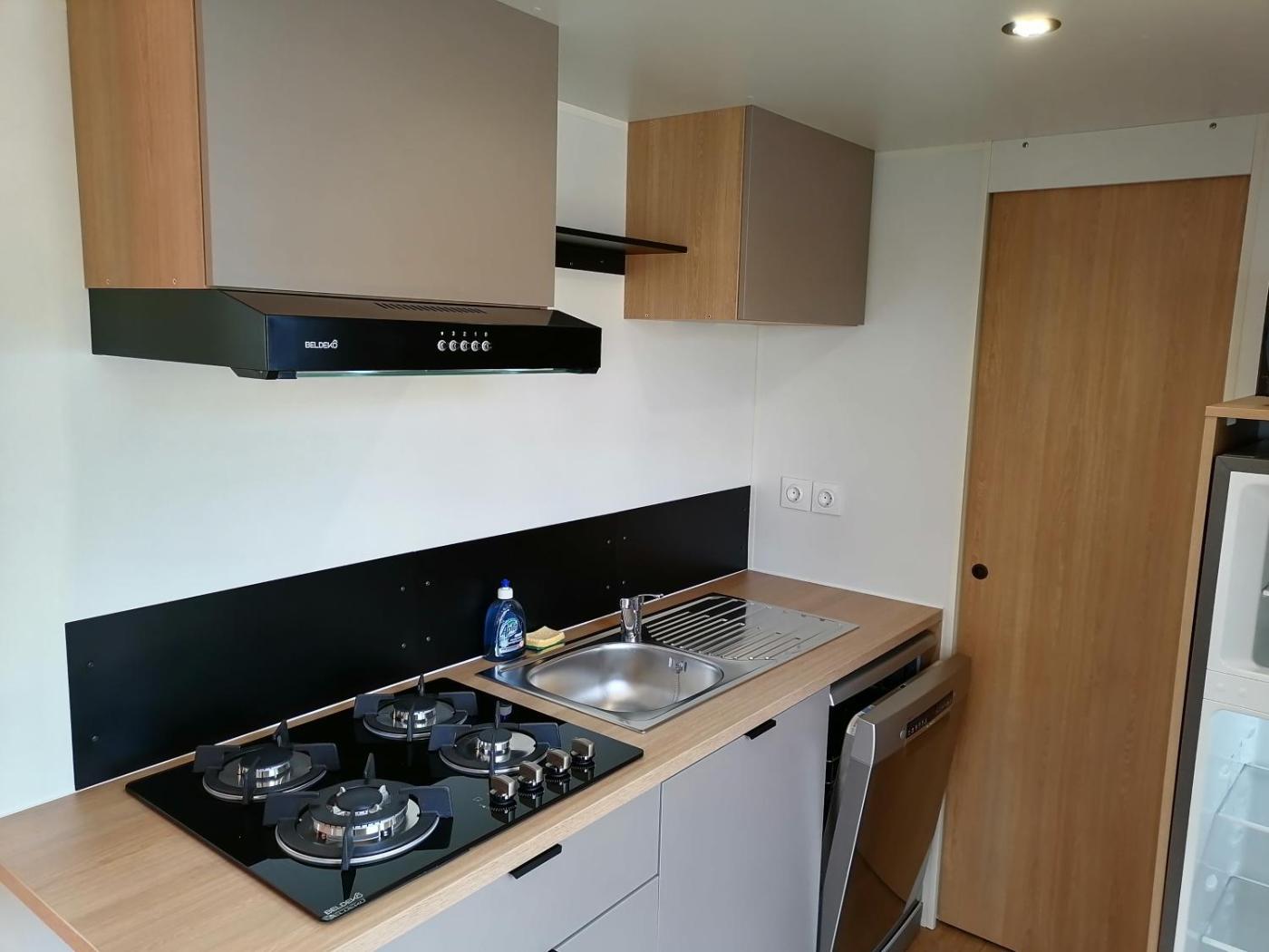 Mobile Home. Ce mobile home avec terrasse dispose d’un salon avec coin couchage et télévision, d’une kitchenette, de la climatisation, d’une salle de bains avec douche. Il comporte 2 chambres et 1 canapé-lit. Les serviettes et le linge de lit ne sont pas fournis. ;