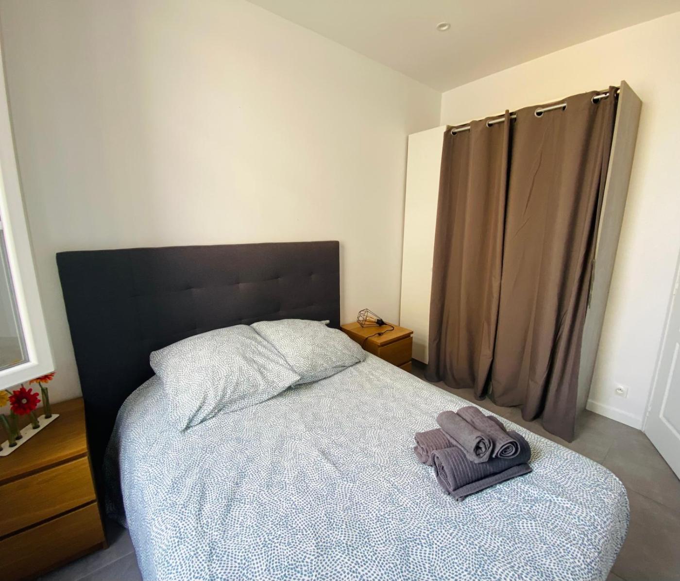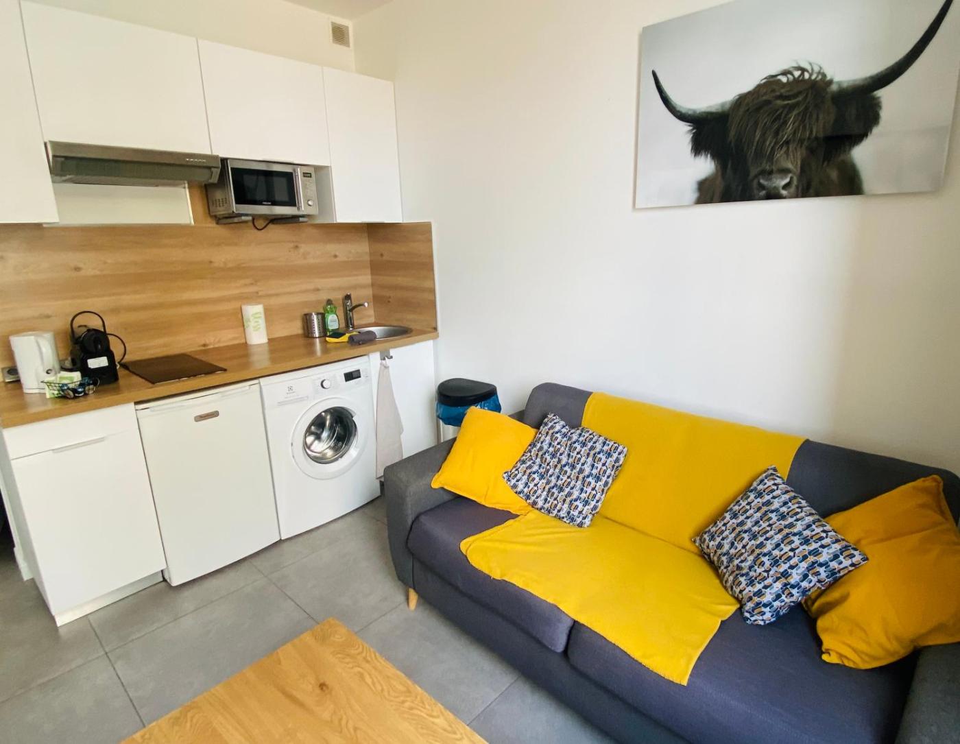Appartement 1 Chambre. Featuring a private entrance, this air-conditioned apartment comprises 1 living room, 1 separate bedroom and 1 bathroom with a shower and a hairdryer. Meals can be prepared in the kitchen, which comes with a refrigerator, kitchenware and a microwave. The apartment provides a flat-screen TV, a washing machine, a tea and coffee maker, a dining area as well as city views. The unit offers 2 beds.